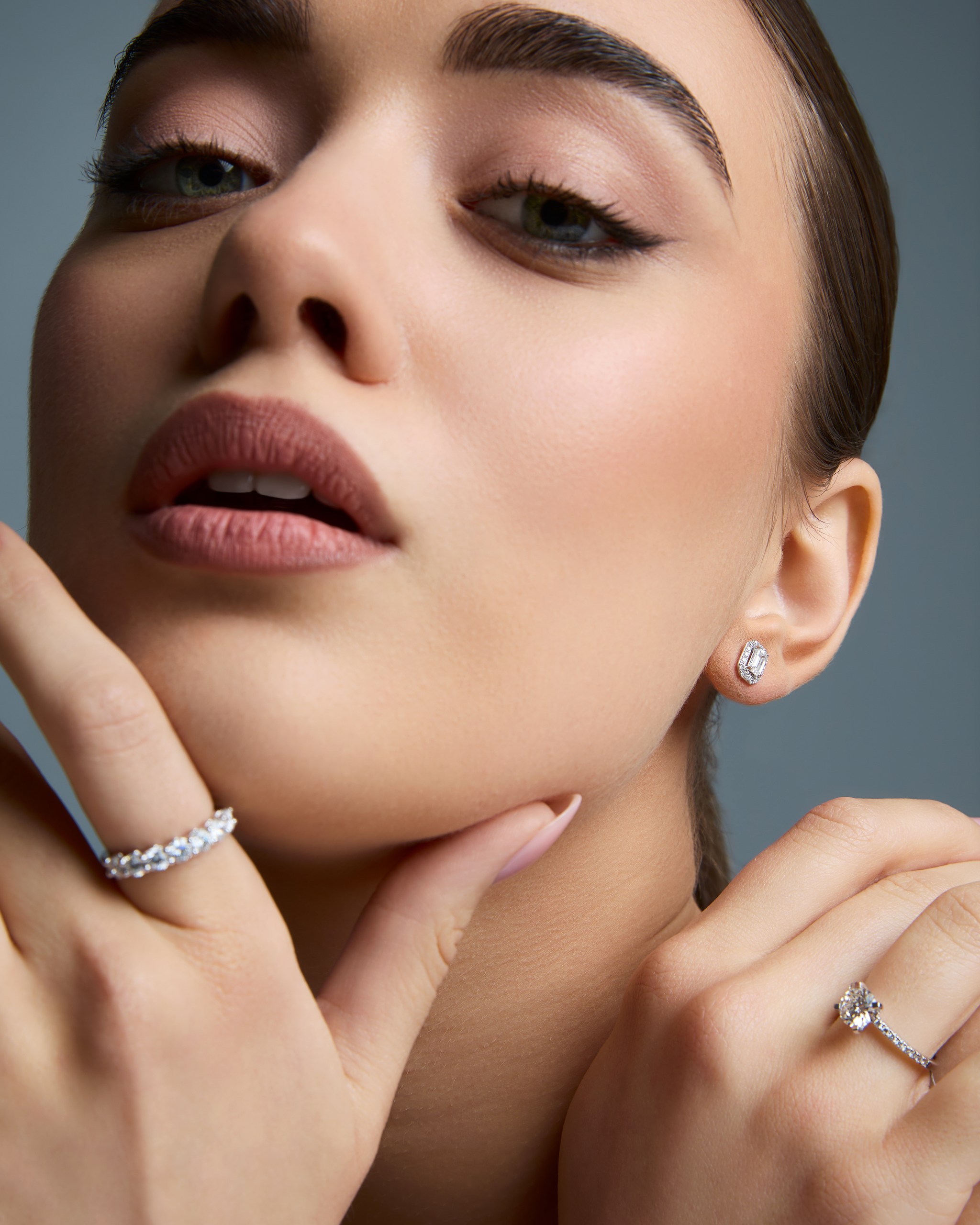 0.74 karato „The Vogue“ kryželis ir 1.09 karato „The Iconic“ žiedas su deimantais, pavaizduoti ant modelio