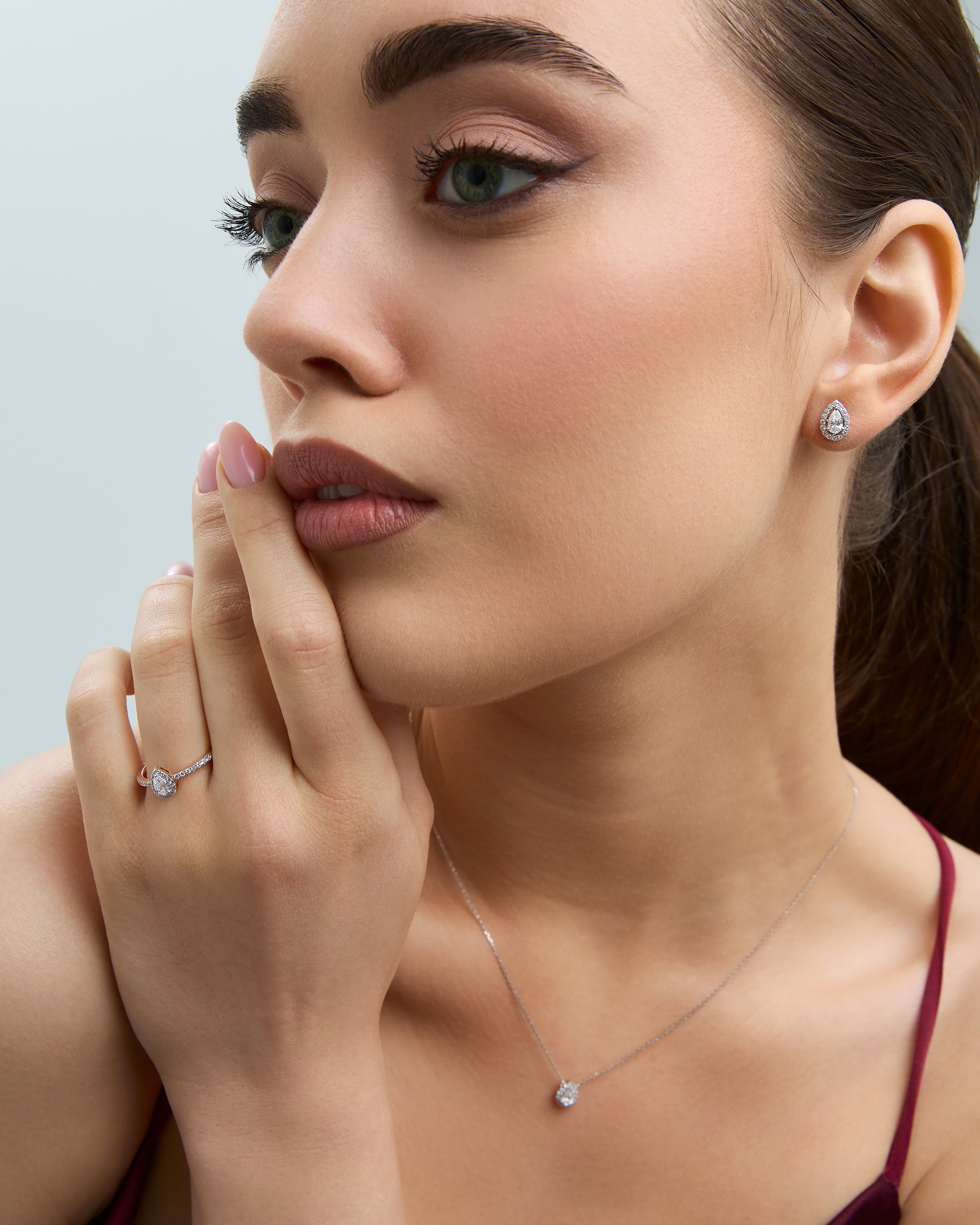 „The Emerald“ kolekcijos žiedas ir grandinėlė su pakabuku ant modelio