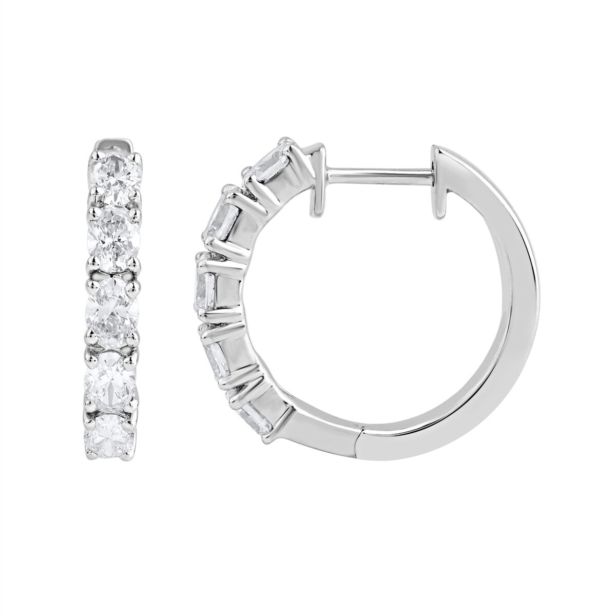 Each earring features five oval-cut diamonds, precisely aligned in a single row to allow light to flow evenly across the entire hoop.