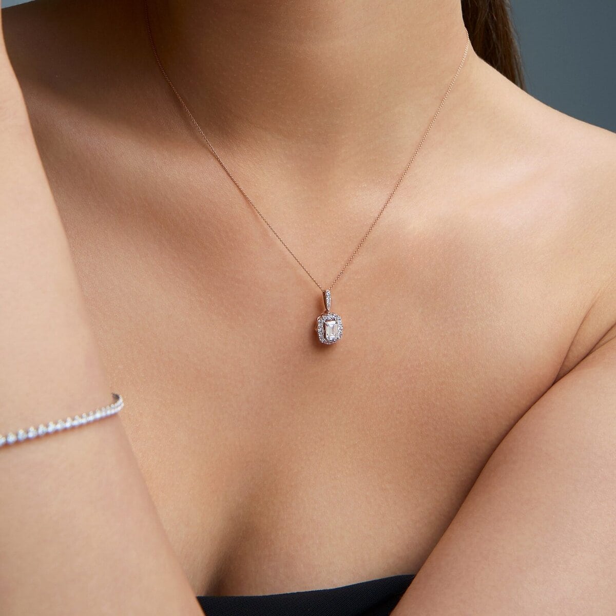 0.95 ct rose gold diamond pendant “The Emerald” – a symbol of luxury and architectural precision, created for the modern woman. At the heart of the pendant lies a stunning 0.67 ct emerald-cut lab-grown diamond—one of the most elegant and refined cuts, celebrated for its mirror-like brilliance and geometric perfection.