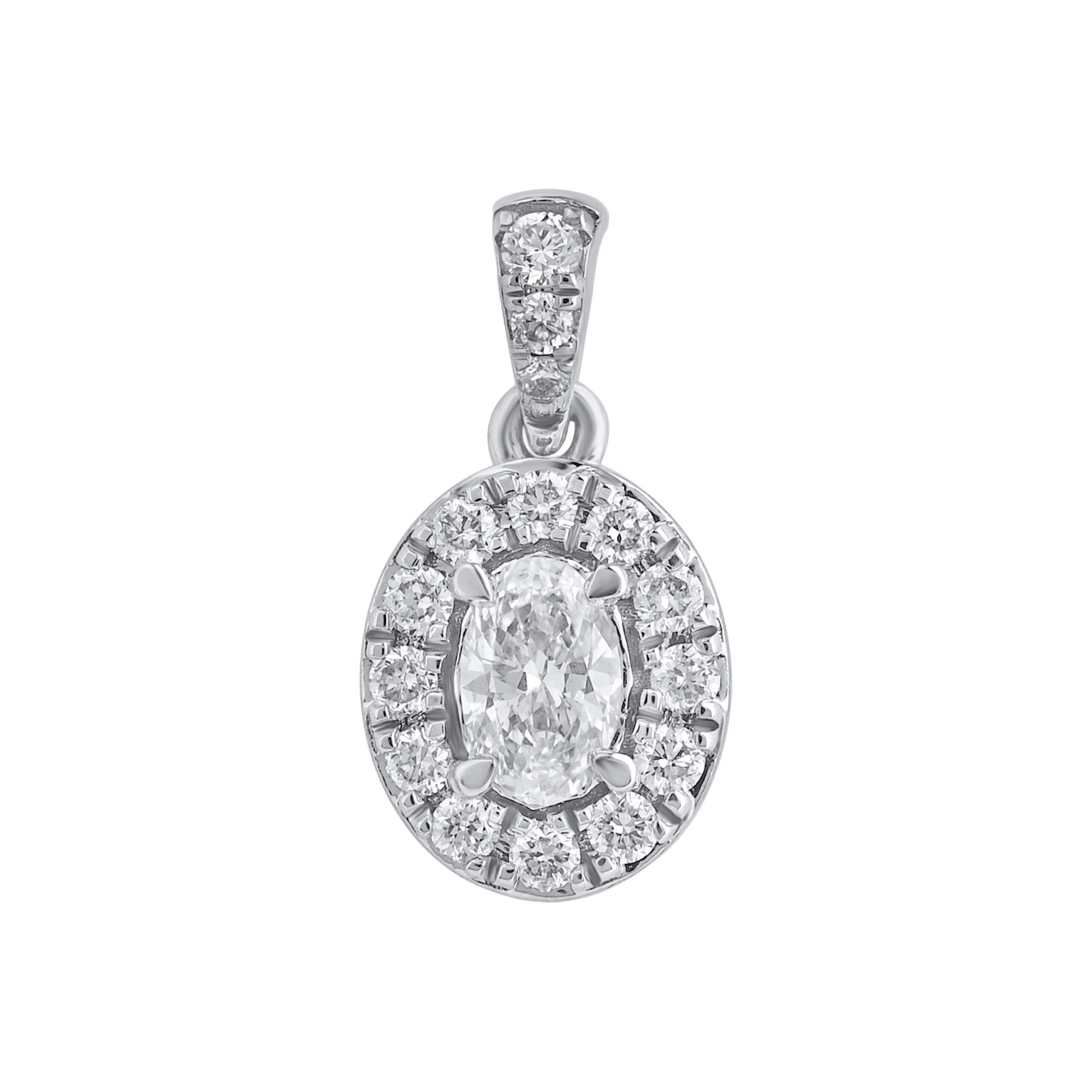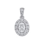 Sukurtas iš balto aukso (585 prabos), šis pakabukas išsiskiria centriniu ovalo formos deimantu (0.155 ct), kurį apjuosia spindintis halo rėmelis iš apvalių deimantų (0.115 ct).