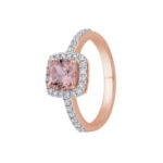Sukurtas iš raudono aukso (585 prabos), šis modelis žavi centriniu cushion formos morganitu (0.96 ct), apsuptu laboratorinių deimantų halo (0.34 ct, E–F spalva, VVS–VS skaidrumas). Bendras svoris – 1.30 ct.